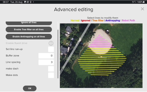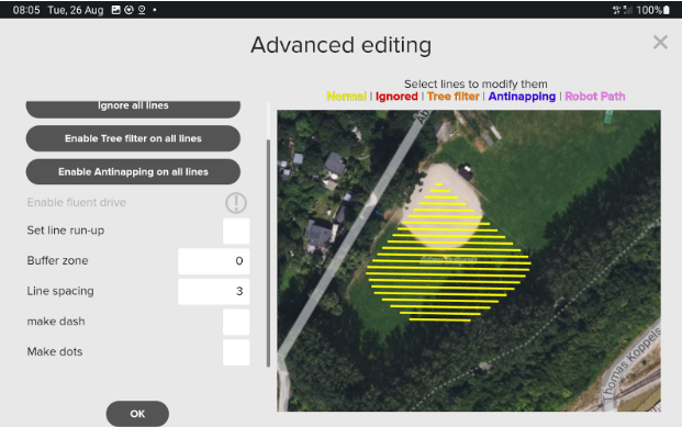 Make sure to tap each line individually and continue tapping it until it turns pink, confirming that it has been converted into a robot path