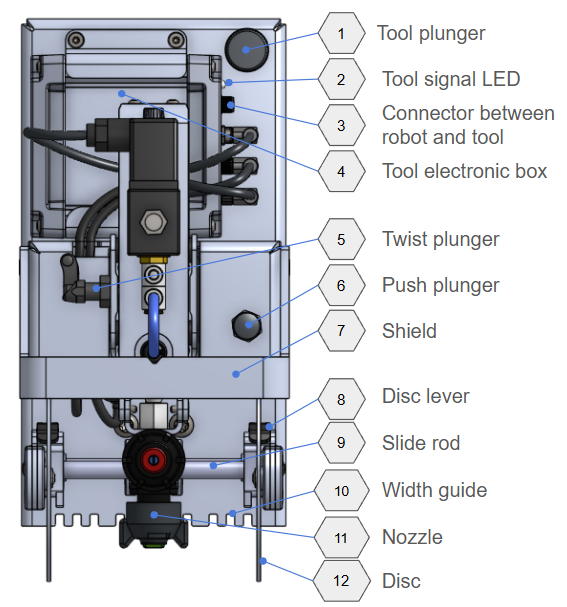 - Stow Tool & Discs: Move the tool to the top position using the Tool Plunger (1) and swing the Discs (12) up until they lock in the top position.