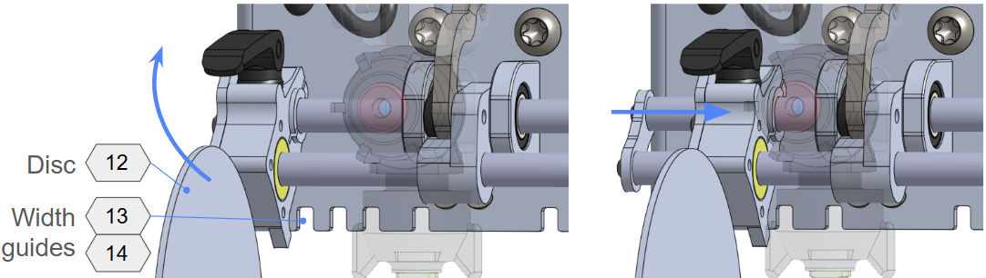 - Rotate the Disc (12) downwards, ensuring the Male Width Guide (14) correctly aligns and falls into the hole of the Female Width Guide (13).