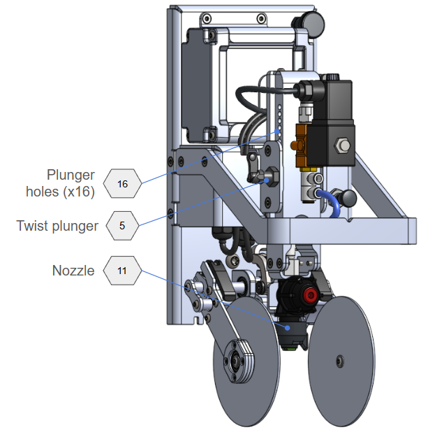 - Lock: Always lock the Twist Plunger (5) after adjusting the nozzle height.