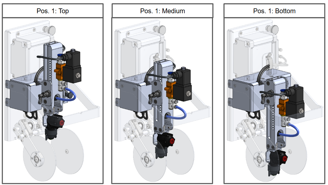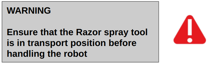 - Set Transport Position: Before handling or transporting the robot, always set the Razor Spray Tool to the transport position. Move the Tool Plunger (1) to the 1st hole (the very top).