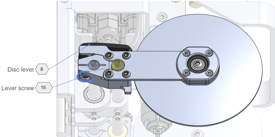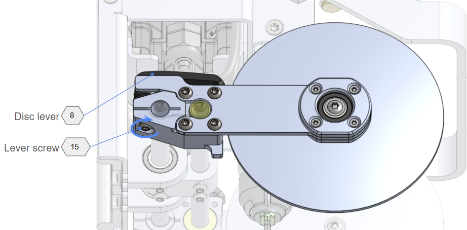 - Loosen Screw: Locate the Disc Lever Screw (15). Use a TX20 bit to loosen it all the way, while holding the Disc Lever (8) to counter the rotation.