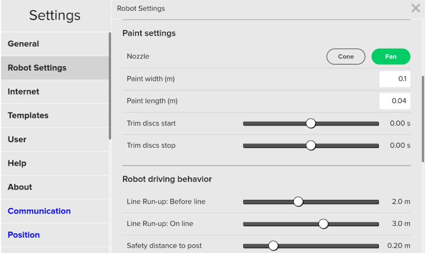 These adjustments are controlled on your tablet under: Settings > Robot Settings > Paint Settings. You will adjust two main controls: "Trim Discs Start" and "Trim Discs Stop."