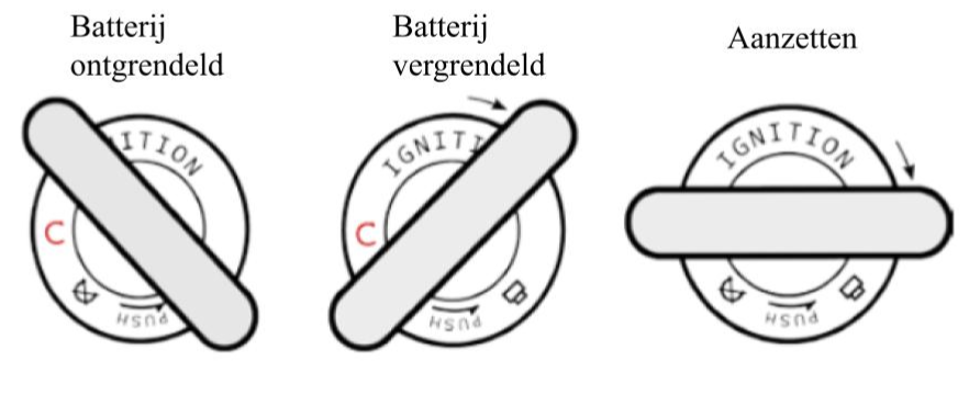 Afbeelding: Batterijsleutel in de batterij ontgrendeld, batterij vergrendeld, en aan posities