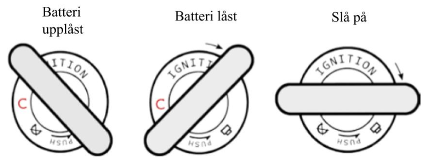 Bild: Batterinyckel i batteri olåst, batteri låst och ström på positioner